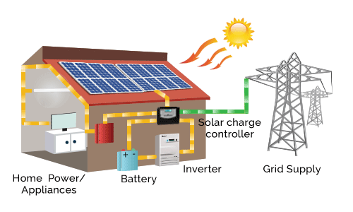 When your solar power plant remains connected to the grid’s power lines and has a backup battery system to store excess power is known as hybrid solar system or solar solar hybrid plant. The sun’s energy absorbed by the solar panels goes through an inverter to create usable electricity. From there, electricity either goes to your home, to your battery, or to the grid.
